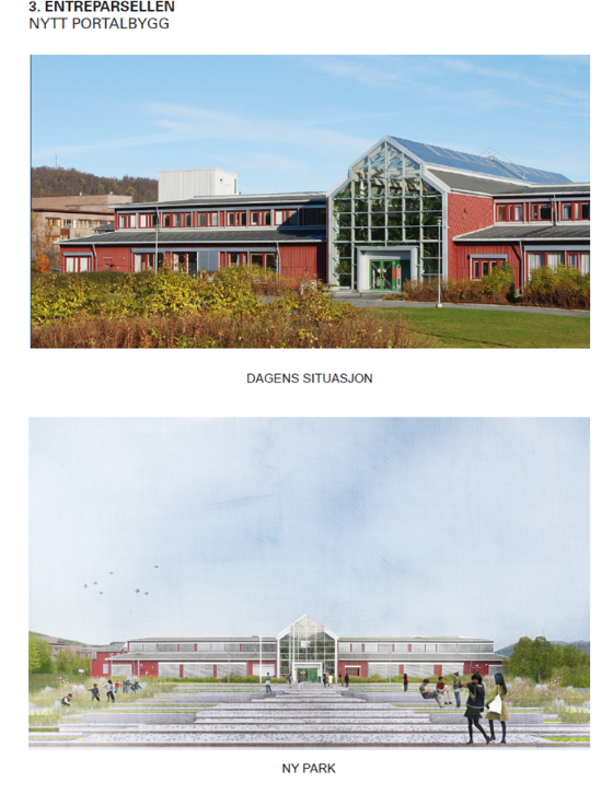| Inngangen til UiT. Bilde som viser dagens situasjon og en mulig utvikling av inngangen. |
