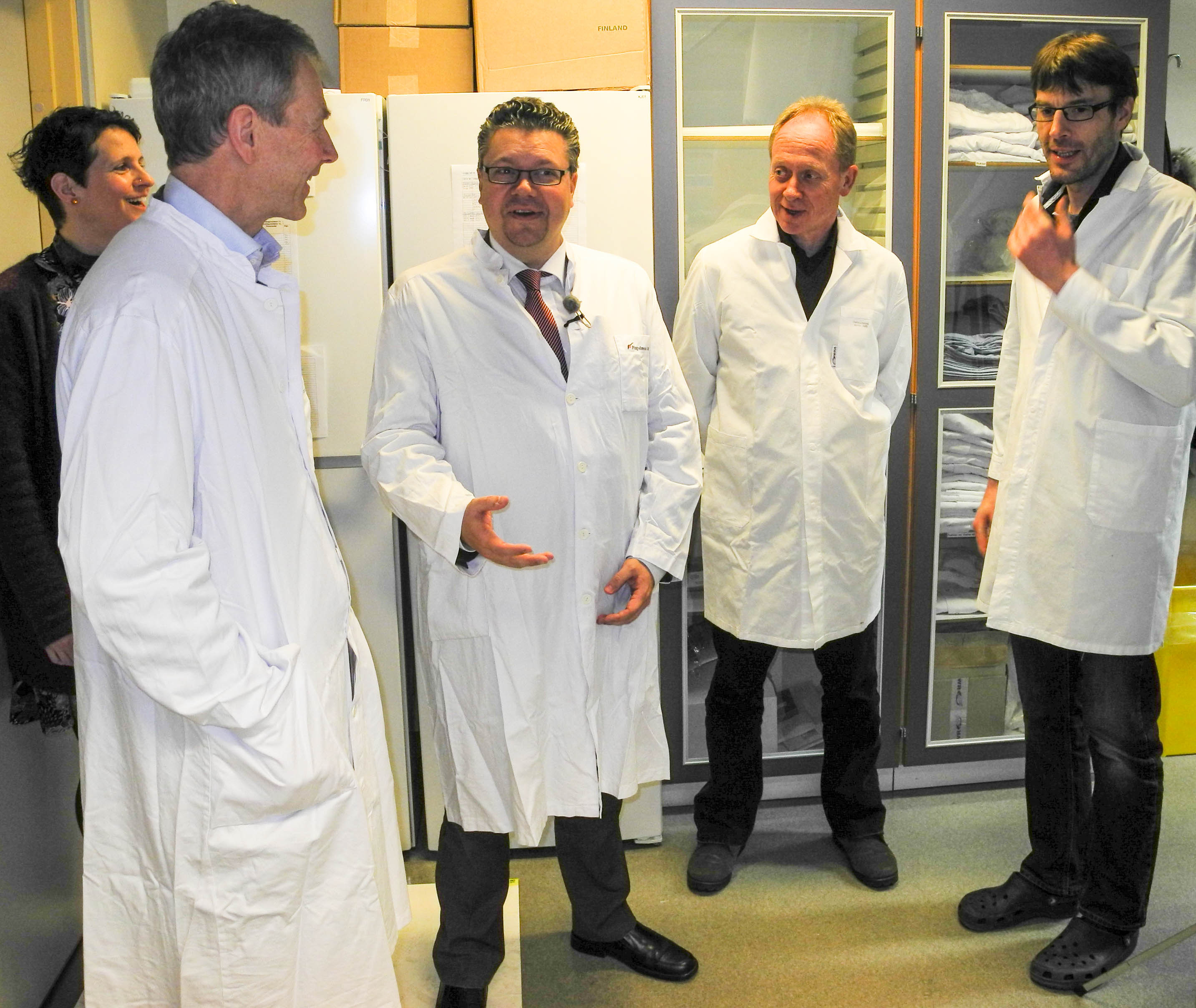 | Stemningen var god da Ulf Leirstein og Jan Arvid Ellingsen fra FrP hilste på da ansatte ved Rettsgenetisk senter, UiT. Politikerne fikk også et innblikk i forskningsprosjektene som gjøres nå. Foto: Elisabeth Øvreberg |