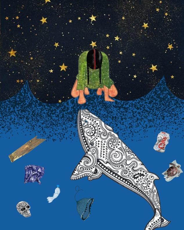 The final poster is designed to be displayed in public spaces and directly addresses the public. In the foreground is a whale, a symbol of ocean ecosystems and the negative effects of marine pollution, stylized with decorative motifs that are inspired by Māori culture, such as intertwined lines, spirals, and elements that express the connection with nature. Above the whale is an indigenous figure to represent the Māori Community, whose connection with nature is now at risk of marginalization and silencing.