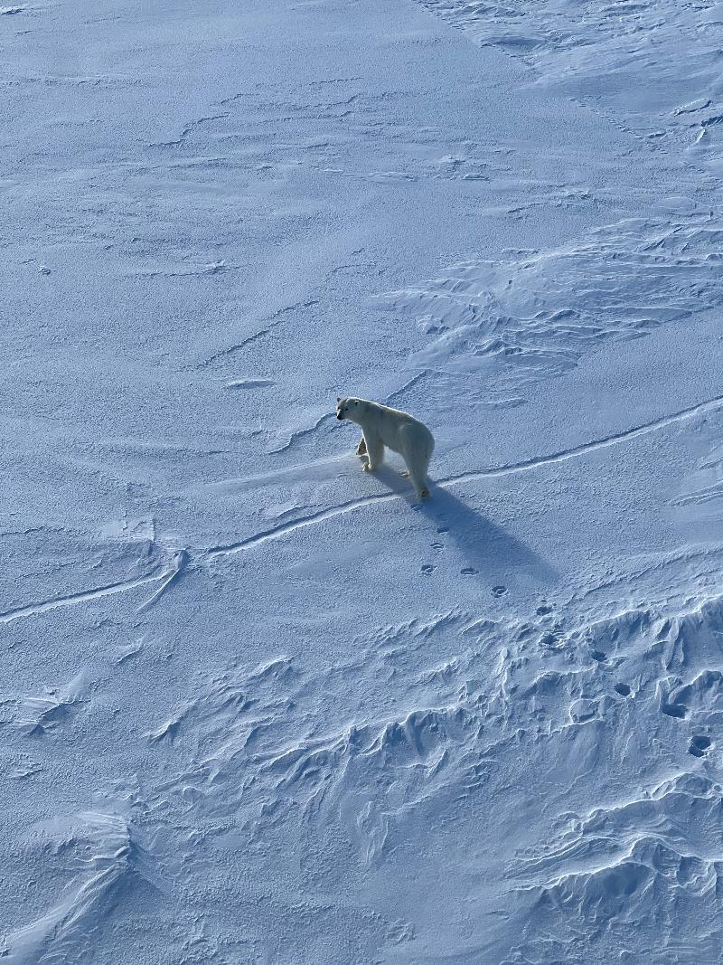 A polar bear is spotted while en route to the start position of our home sea ice floe. Most are excited and race to catch a glimpse of isbjørn (Norwegian for polar bear). The enthusiasm however is not shared by the Chief Scientist who would like to see nothing but algae this trip.