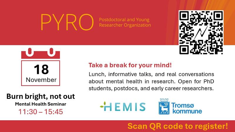 On Tuesday November 18th we hosted a Mental Health seminar 2025, under the idea “Burn birght, not out!”. We were joined by representatives from HEMIS, Tromsø kummune, and unions: Forskerforbundet and Tekna, who provided us with information about the resources available for students and employees at UiT. After the seminar we continued with a discussion following the topics suggested by our members such as how to deal with student-supervisor conflicts, how to deal with life insecurities of researcher life especially regarding temporary work contracts and uncertain research funding.
