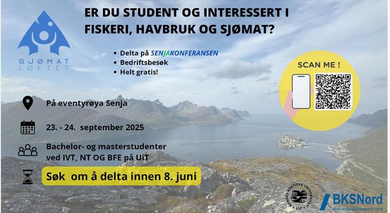 23. - 24. september 2025 inviterer Sjømatløftet utvalgte studenter ved UiT til å være med på SenJAkonferansen for å bygge nettverk, lære fra bransjen og møte potensielle arbeidsgiver og folk med interesse for sjømat over to innholdsrike dager på Senja.