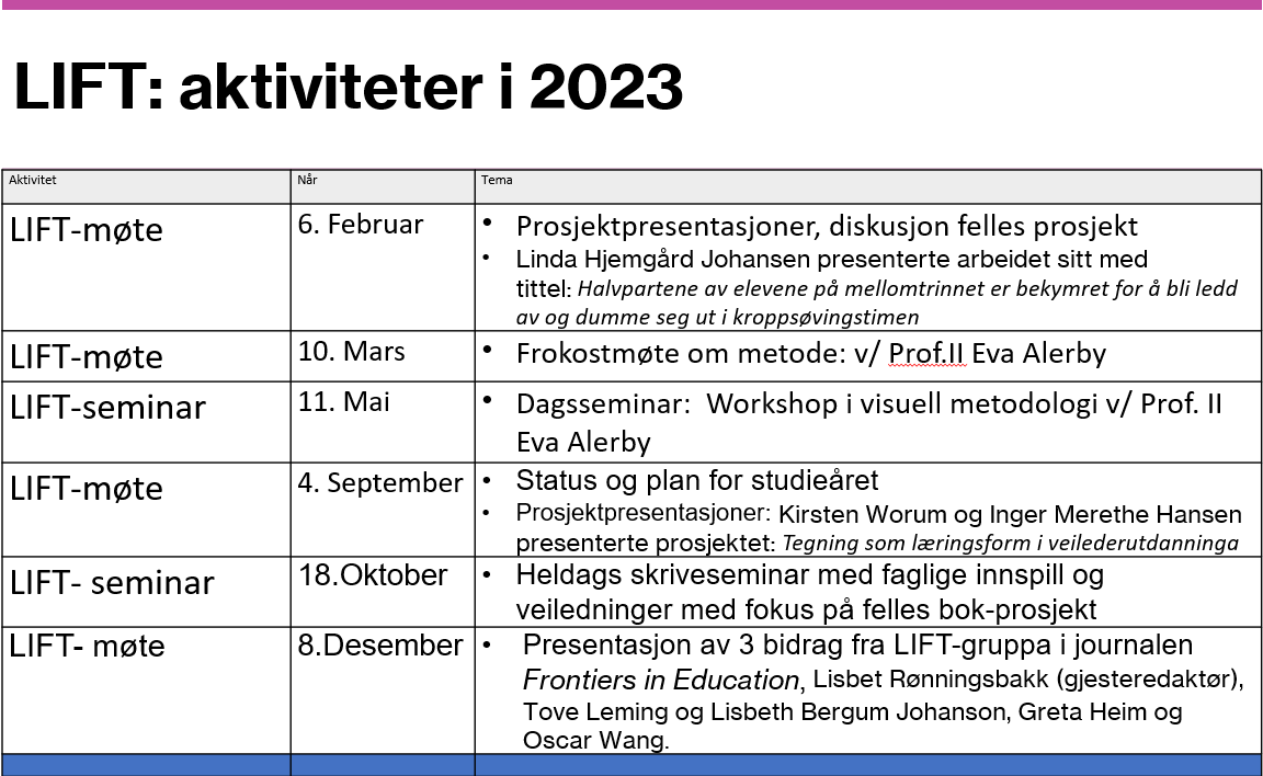 | LIFT-møte | November eller desember | Bokprosjekt status og fremlegg |