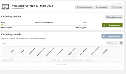 Når sensurperioden er startet vil du få opp en oppgaveliste med alle besvarelser/kandidater som er tildelt deg for sensur, samt en fremgangsrapport. For å begynne på sensurarbeidet kan man enten klikke på «start vurdering,» eller på ikonet i handlingskollonnen til høyre for kandidatoversikten: