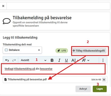 Her kan du enten skrive inn dine merknader til besvarelsen i tekstfeltet ( 1) eller legge tilbakemeldingen inn som en vedlagt fil (2).