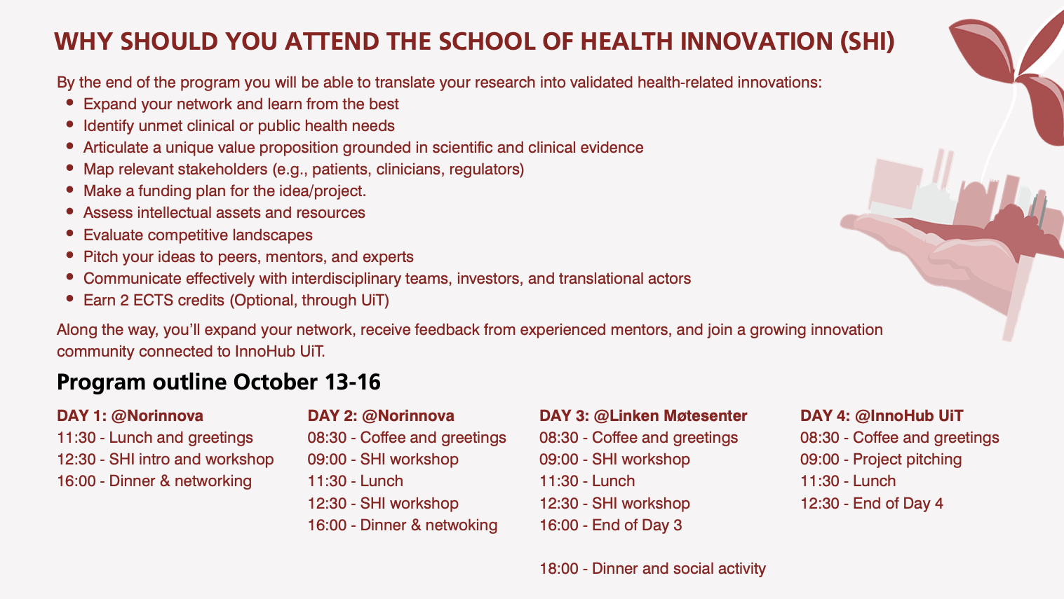 If you have any questions about the Boot Camp and the School of Health Innovation, please contact business developer Håkon Gustafson Giæver in Norinnova: hakon@norinnova.no