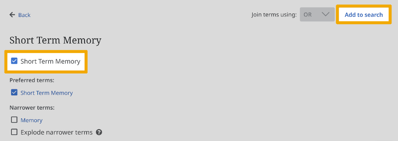 From ‘Entry terms’ to ‘Radiculopathy’, we choose ‘Radiculopath*’ and ‘Nerve Root Disorder*’. Our box model for the literature search now looks like this: