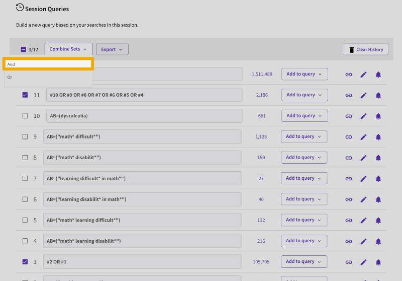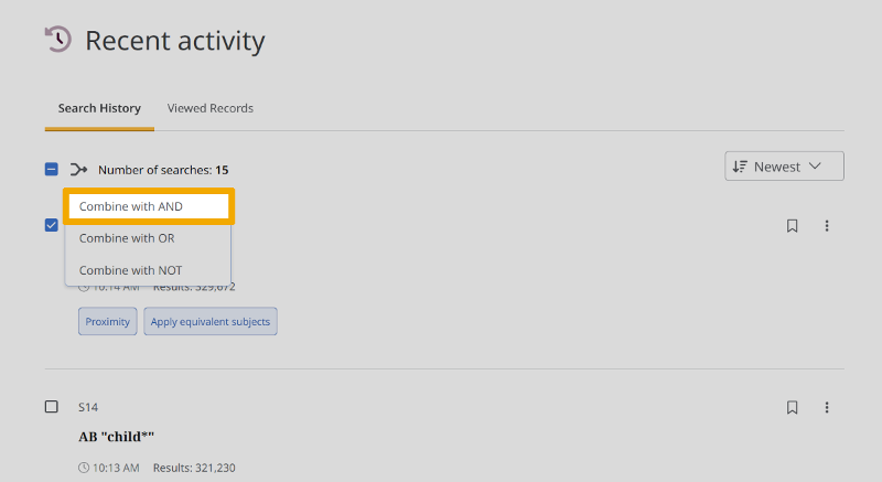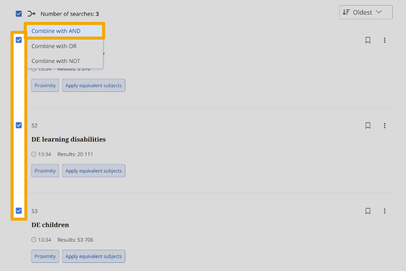We can now make our final compilation of this search by clicking on the three dots under ‘Actions’, and choosing AND. The search then becomes: #4 AND #8 AND #13: