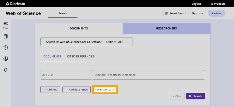 We recommend that you always combine search keywords in ‘Advanced’ (see below). In ‘Advanced’, you have a full overview of all the search keywords you have used, and you can easily see how to combine them into a search.